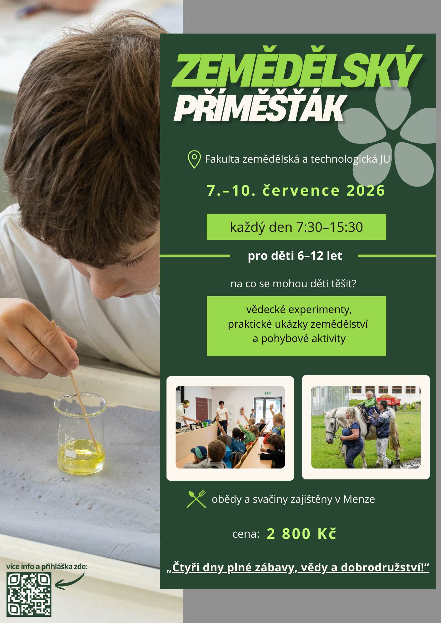 Děti ve věku 6–12 let čekají hravé vědecké pokusy, návštěva statku, výroba zmrzliny i spousta pohybových her venku. Program je pestrý, bezpečný a přizpůsobený počasí.